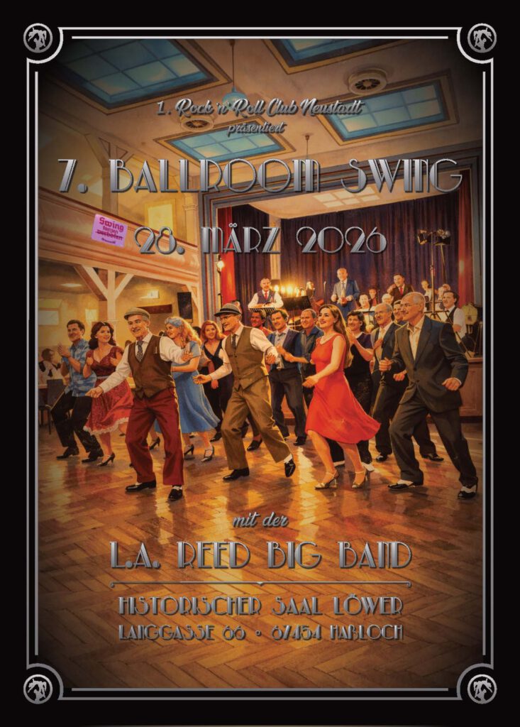 Der 1. Rock ‘n’ Roll Club Neustadt a.d. Weinstraße präsentiert einen Tanzball der besonderen Art, den 7. Ballroom Swing mit der L.A. Reed Big Band, Record Hop mit DJ Tanzwolf Records & DJ Double Bee. Der mittlerweile siebte Ballroom Swing des 1.RRC Neustadt ist gleichermaßen Konzert wie Tanzball. Die L.A. Reed Big Band spielt Swing-Musik aus den großen Jahrzehnten des Swing von Glenn Miller, Benny Goodmann und vielen anderen im echten Big-Band- Sound. Somit kann man die großen Swing-Klassiker nicht nur als Konzert genießen, sondern auch selbst über die Tanzfläche swingen. Für Nichttänzer wird neben dem Hörgenuss auch ein Augenschmaus geboten, denn viele Tanzpaare werden bei den historischen Swing-Tänzen (Lindy-Hop, Shag, Balboa) und Boogie Woogie zu beobachten sein. Es wird aber auch viele Gelegenheiten geben Standard und Latein zu tanzen, nicht zuletzt beim sog. Record Hop.