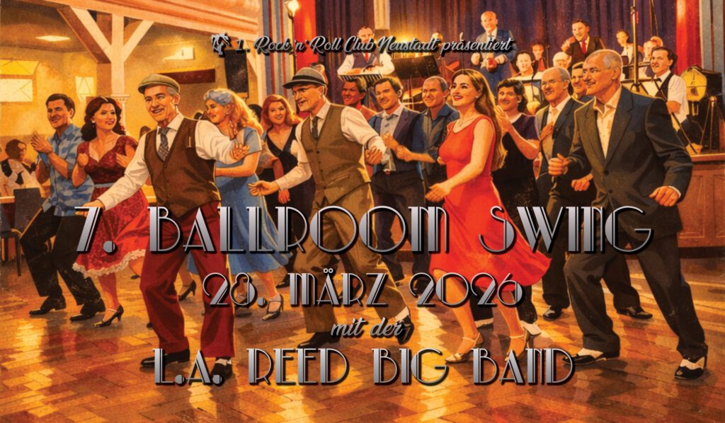 Der 1. Rock ‘n’ Roll Club Neustadt a.d. Weinstraße präsentiert einen Tanzball der besonderen Art, den 7. Ballroom Swing mit der L.A. Reed Big Band, Record Hop mit DJ Tanzwolf Records & DJ Double Bee. Der mittlerweile siebte Ballroom Swing des 1.RRC Neustadt ist gleichermaßen Konzert wie Tanzball. Die L.A. Reed Big Band spielt Swing-Musik aus den großen Jahrzehnten des Swing von Glenn Miller, Benny Goodmann und vielen anderen im echten Big-Band- Sound. Somit kann man die großen Swing-Klassiker nicht nur als Konzert genießen, sondern auch selbst über die Tanzfläche swingen. Für Nichttänzer wird neben dem Hörgenuss auch ein Augenschmaus geboten, denn viele Tanzpaare werden bei den historischen Swing-Tänzen (Lindy-Hop, Shag, Balboa) und Boogie Woogie zu beobachten sein. Es wird aber auch viele Gelegenheiten geben Standard und Latein zu tanzen, nicht zuletzt beim sog. Record Hop.